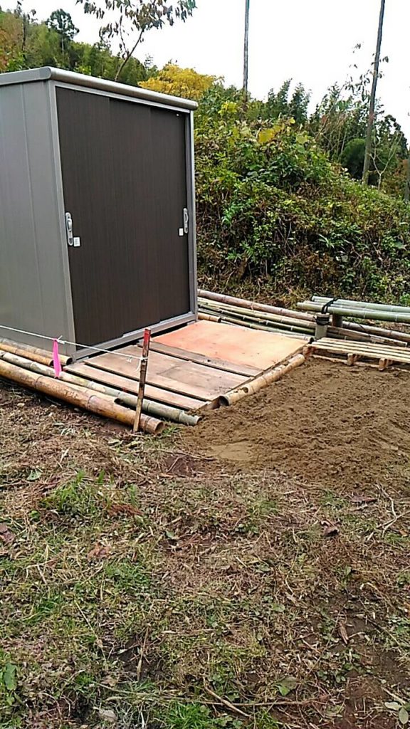 翌日、町口さんが物置前にパレットを設置し、砂で整地してくれました。