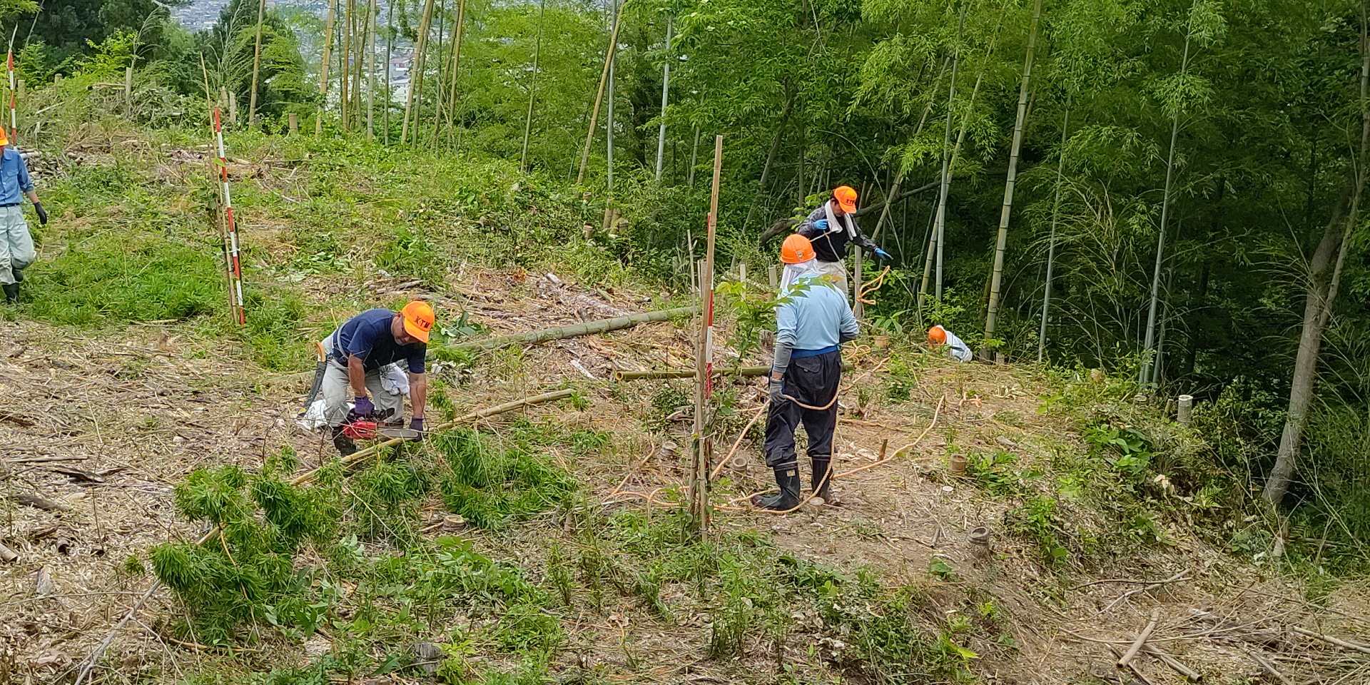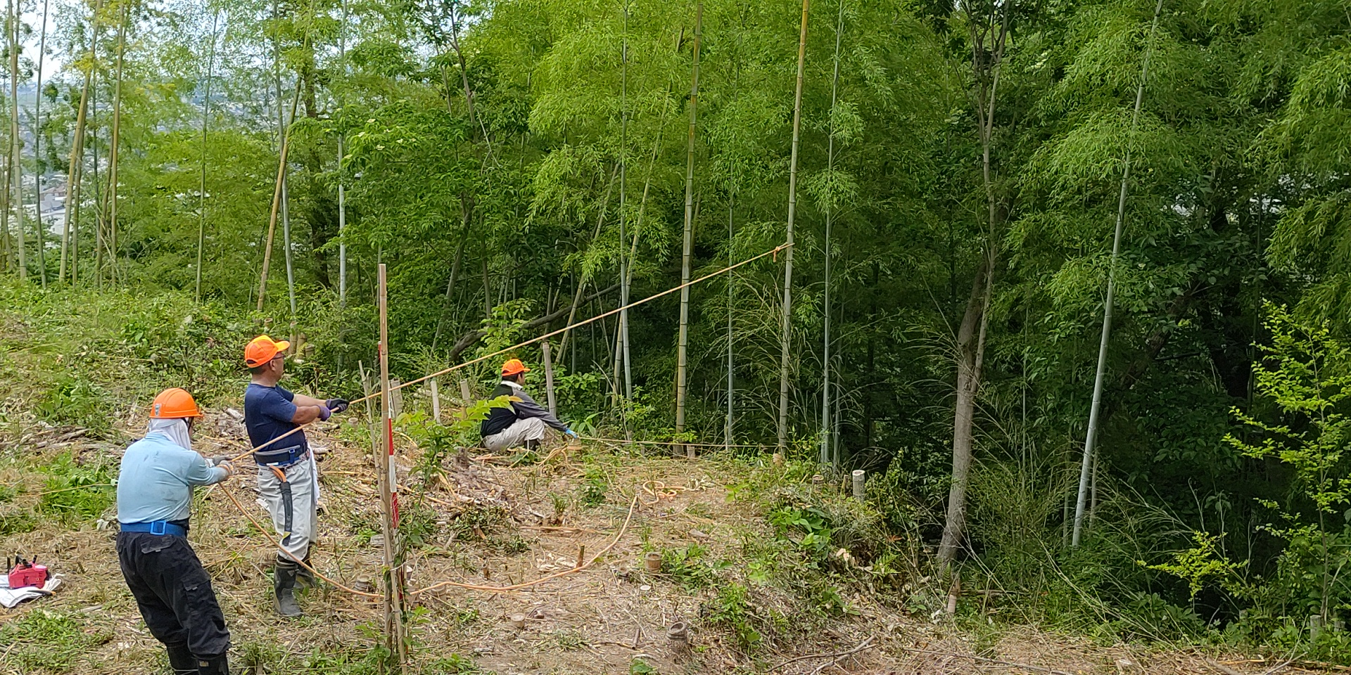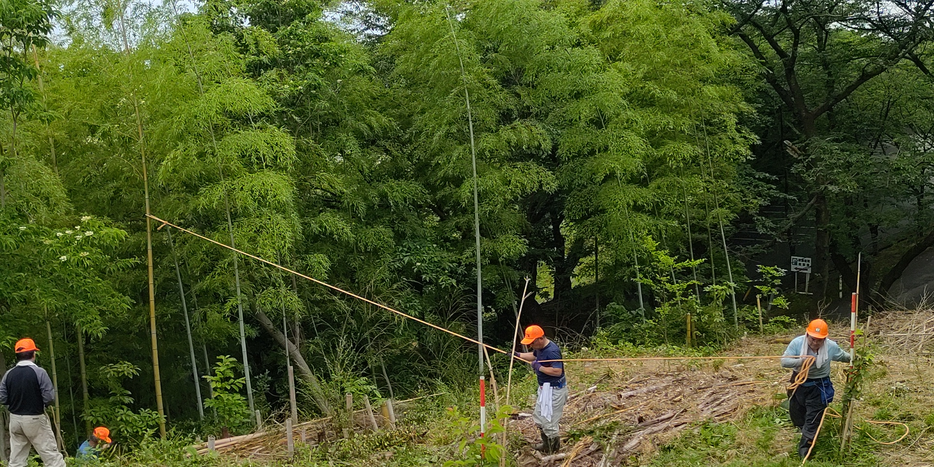 竹整理by 武野に 竹伐採、竹整理、草刈on 投稿日: 2021/06/142021/06/14 2021/06/13(日) 08:00 ~ 11:30 伐採した竹の整理を行いました。 写真と動画は、竹の整理がだいたい終わったところで、電線近くの竹を電線側に倒れないようにみんなで協力して何本か伐採した時のものです。
