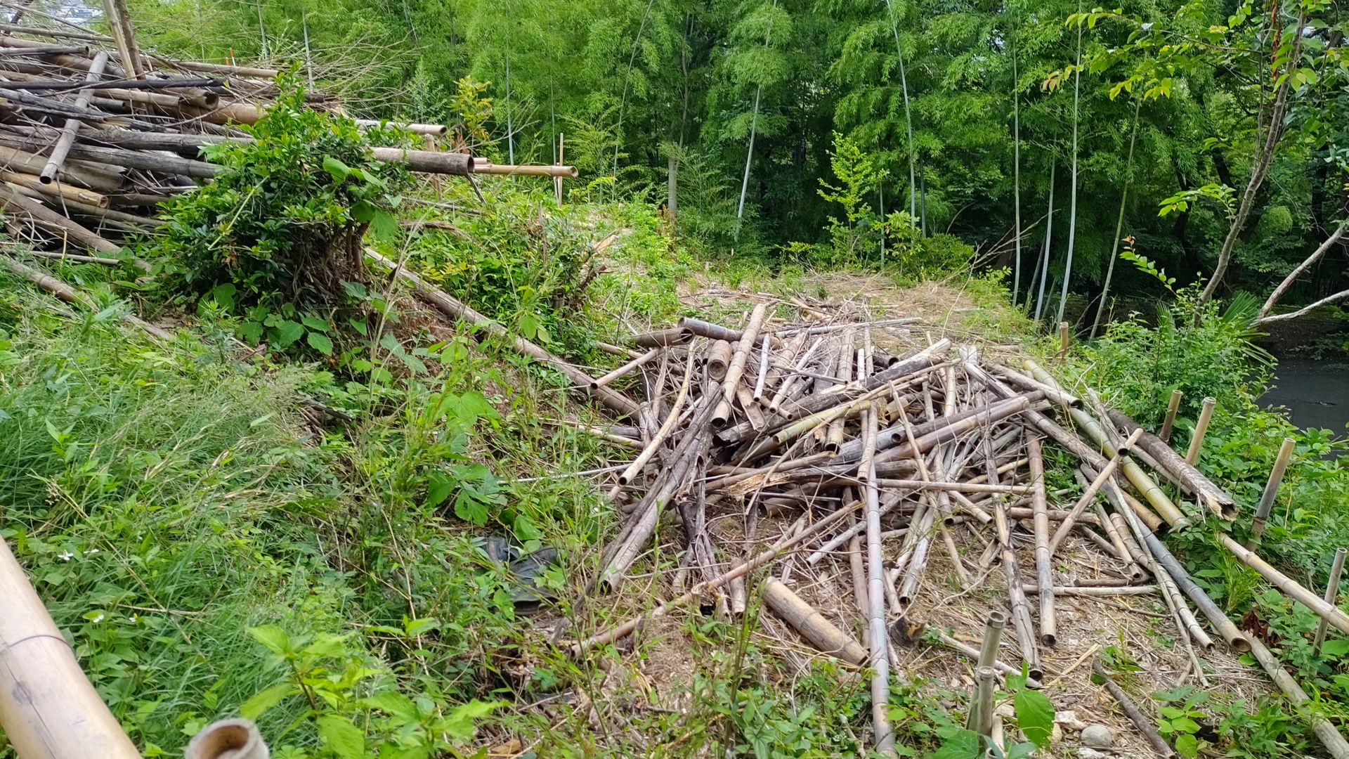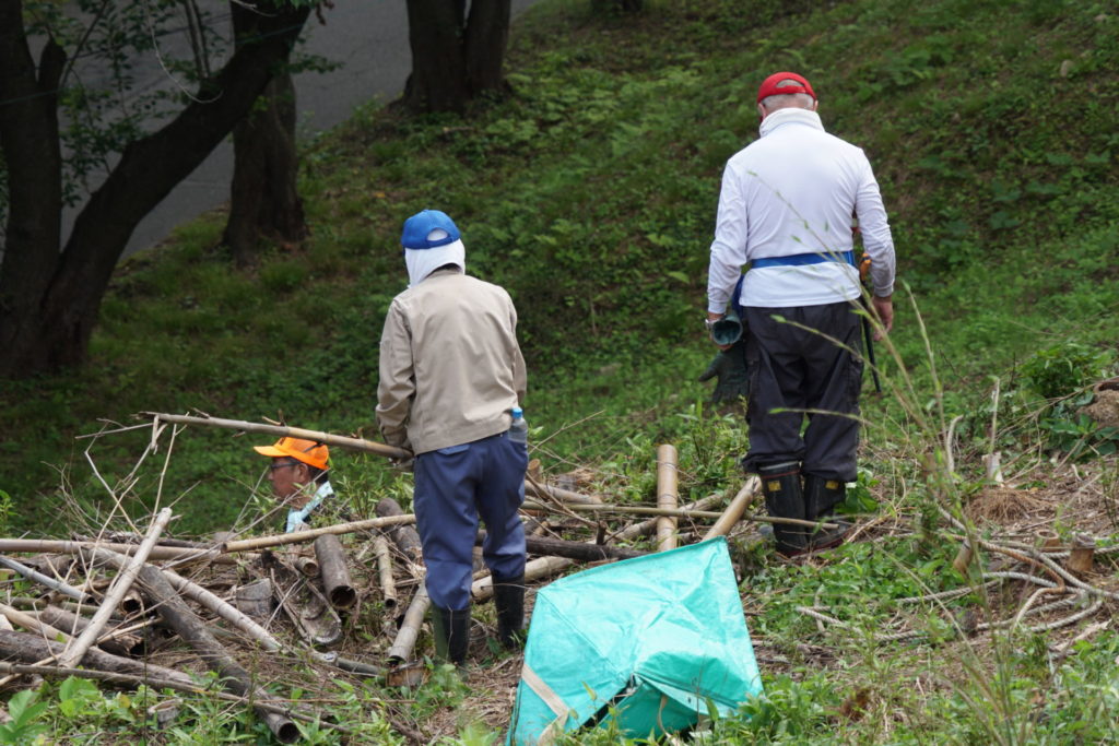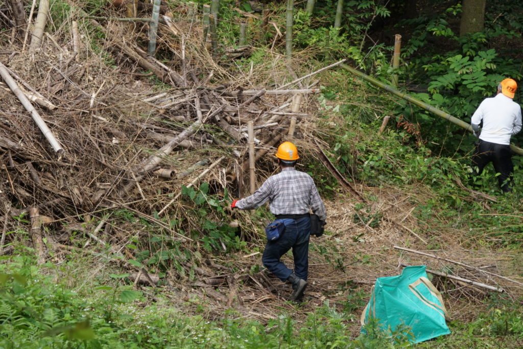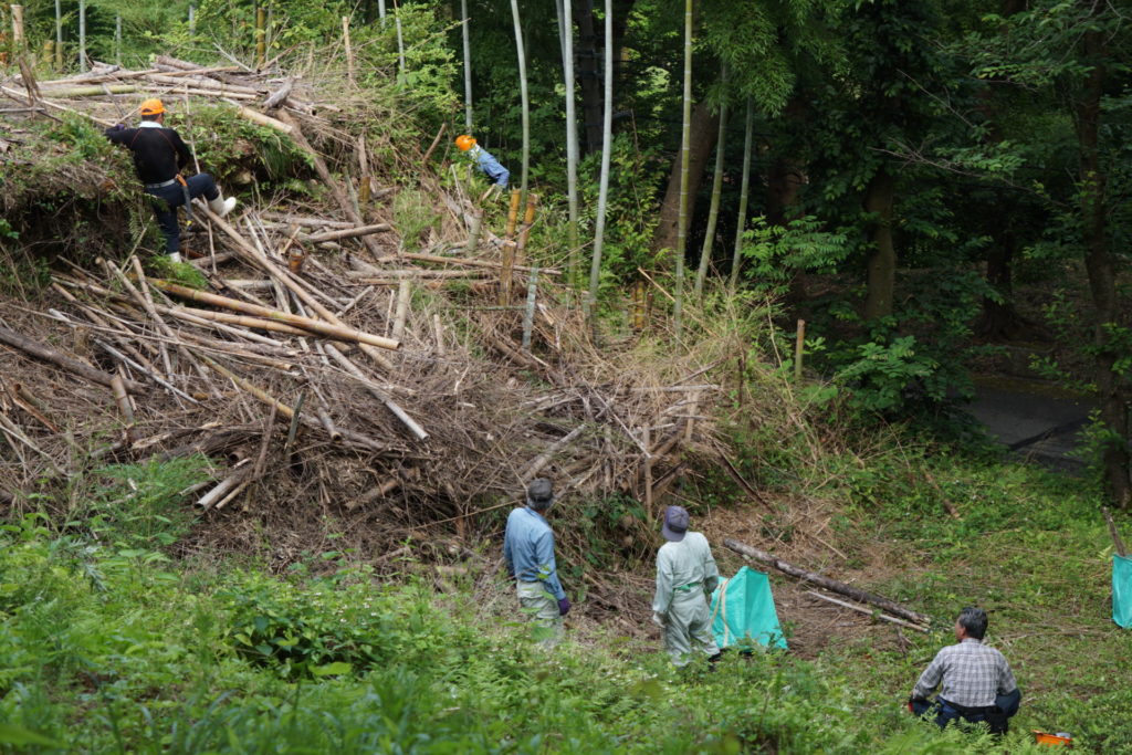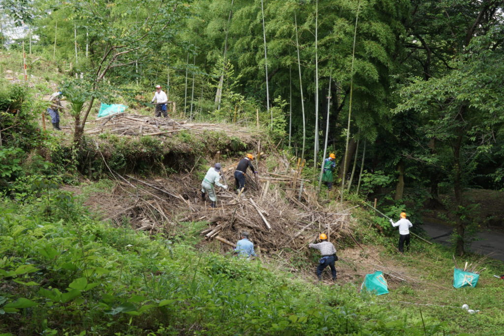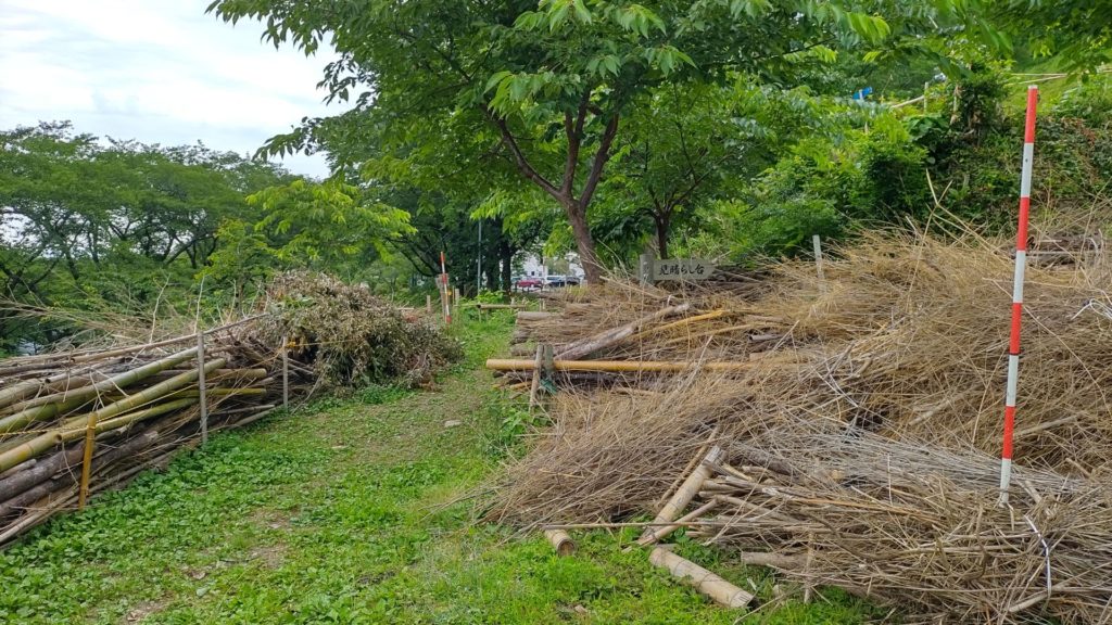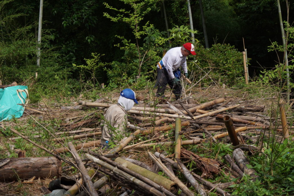 2021/6/27(日) 08:00~10:00 メンバー9人で棚下に放り投げていた竹を、粉砕機にかけられるように、倉庫前に集積しました。