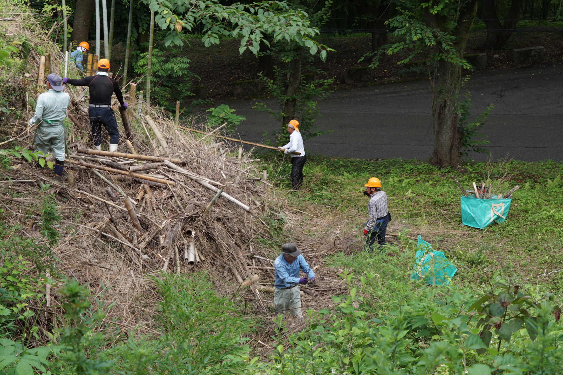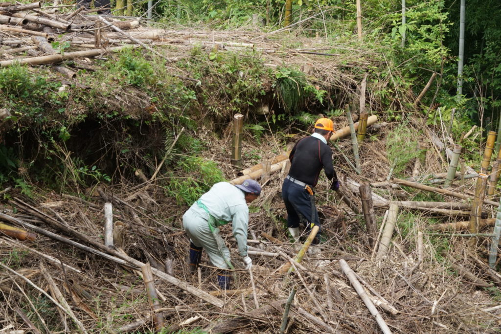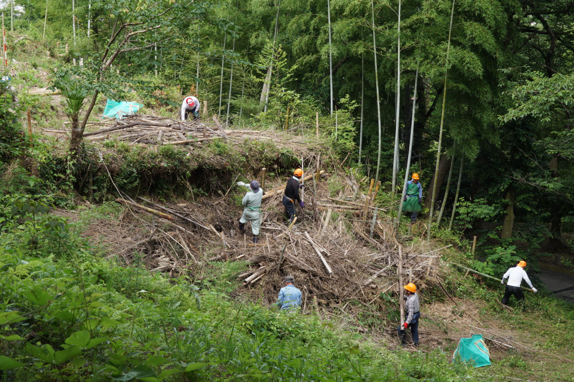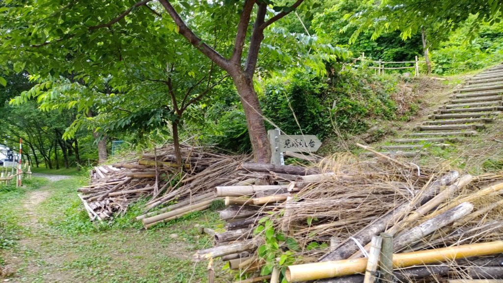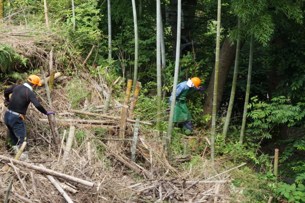 2021/6/27(日) 08:00~10:00 メンバー9人で棚下に放り投げていた竹を、粉砕機にかけられるように、倉庫前に集積しました。
