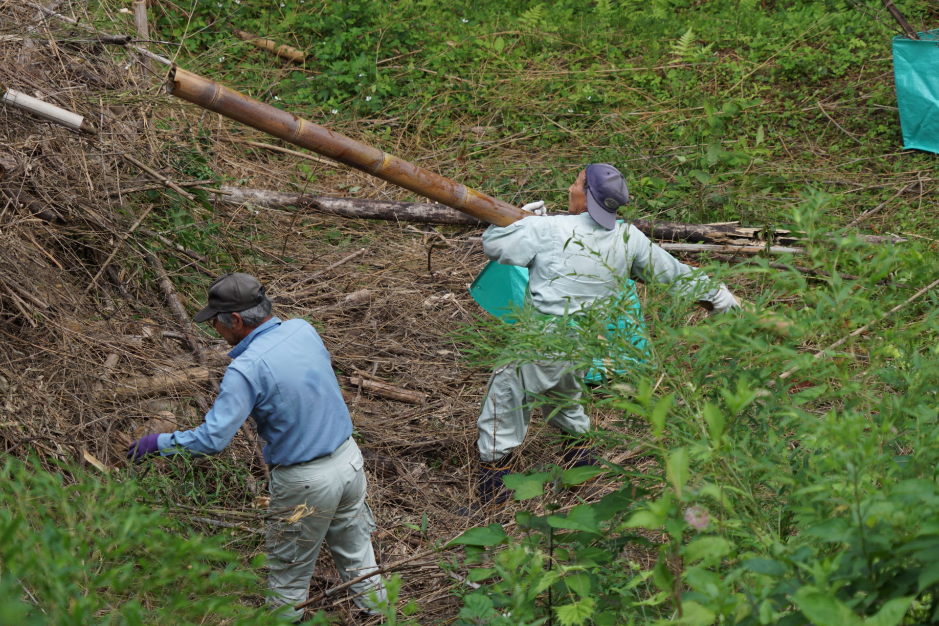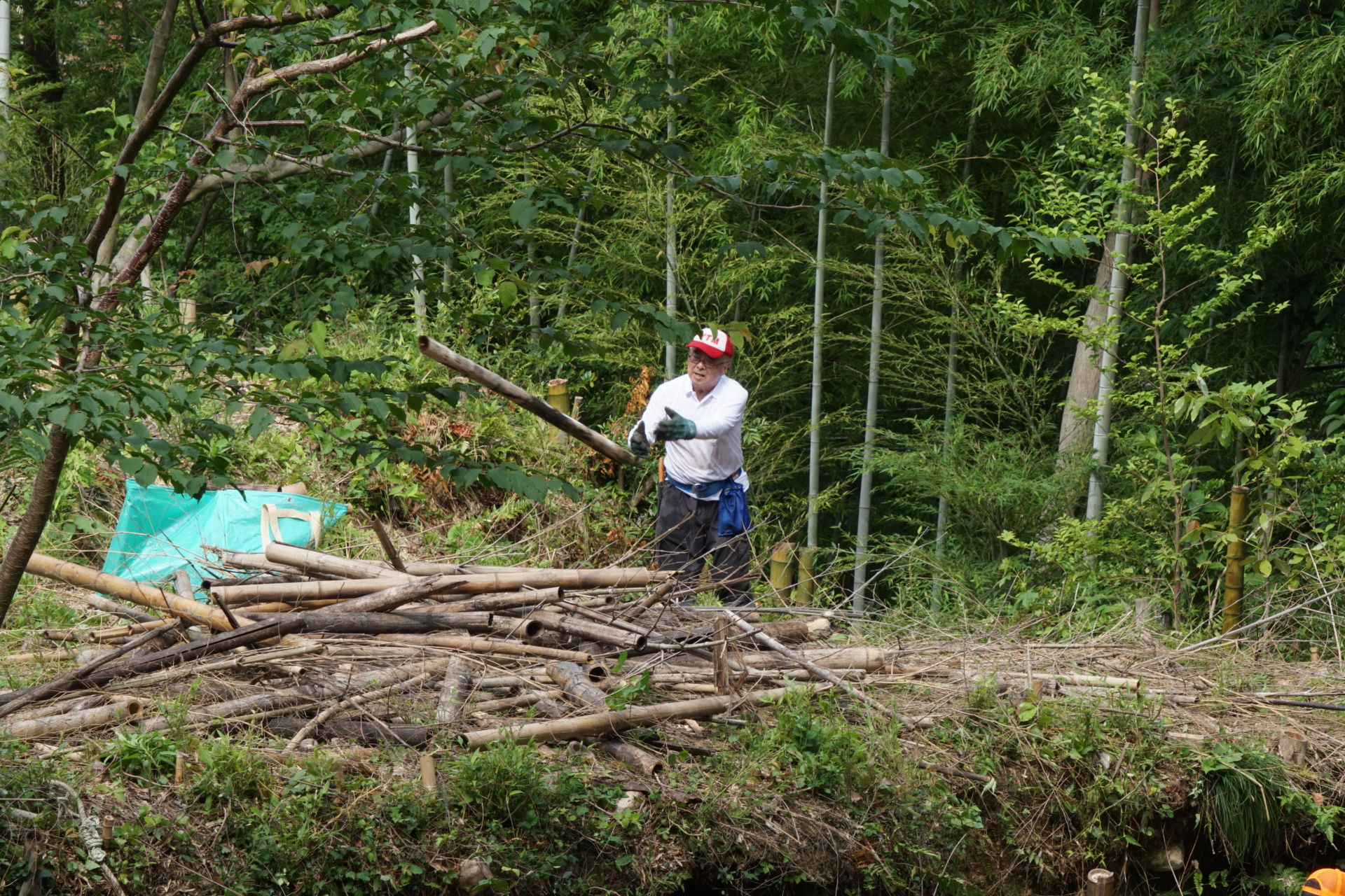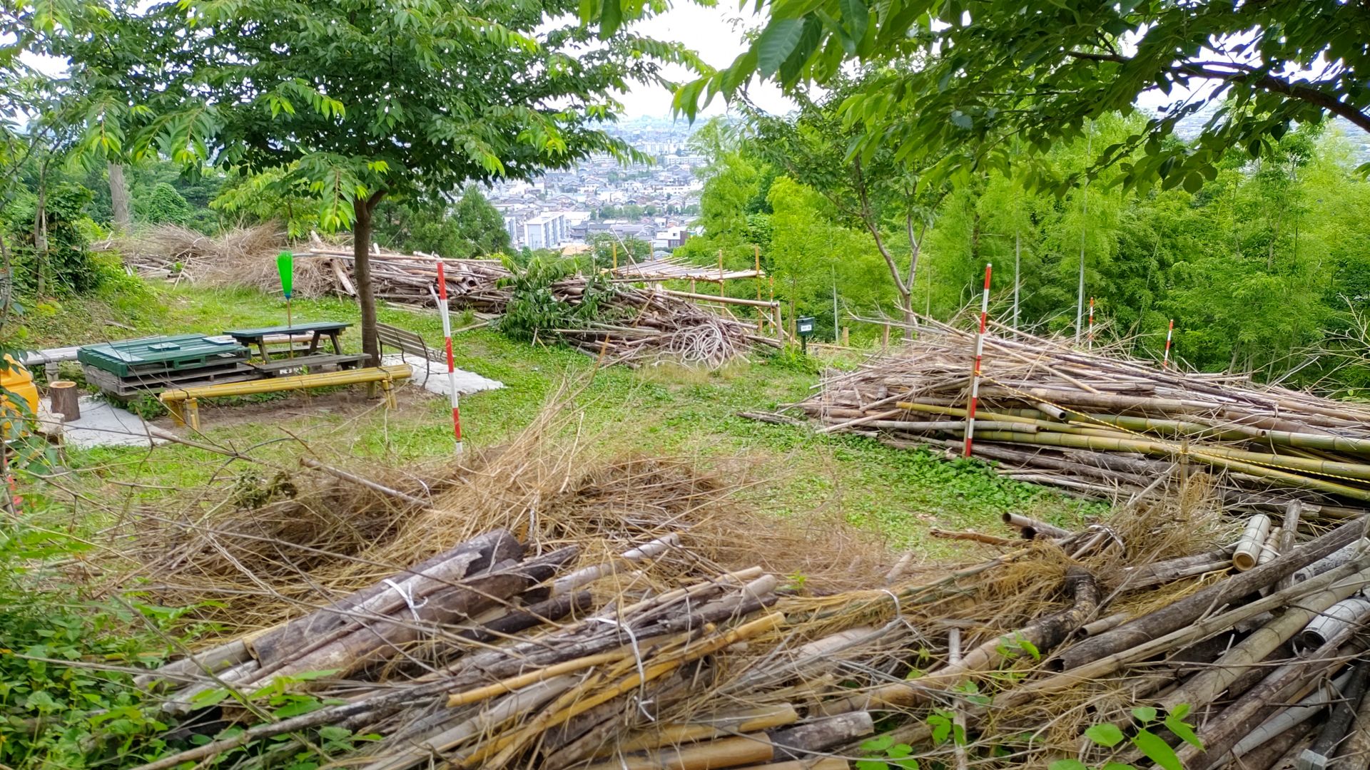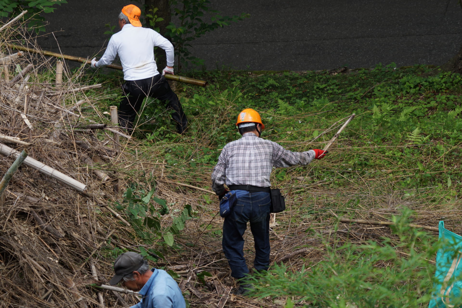 2021/6/27(日) 08:00~10:00 メンバー9人で棚下に放り投げていた竹を、粉砕機にかけられるように、倉庫前に集積しました。