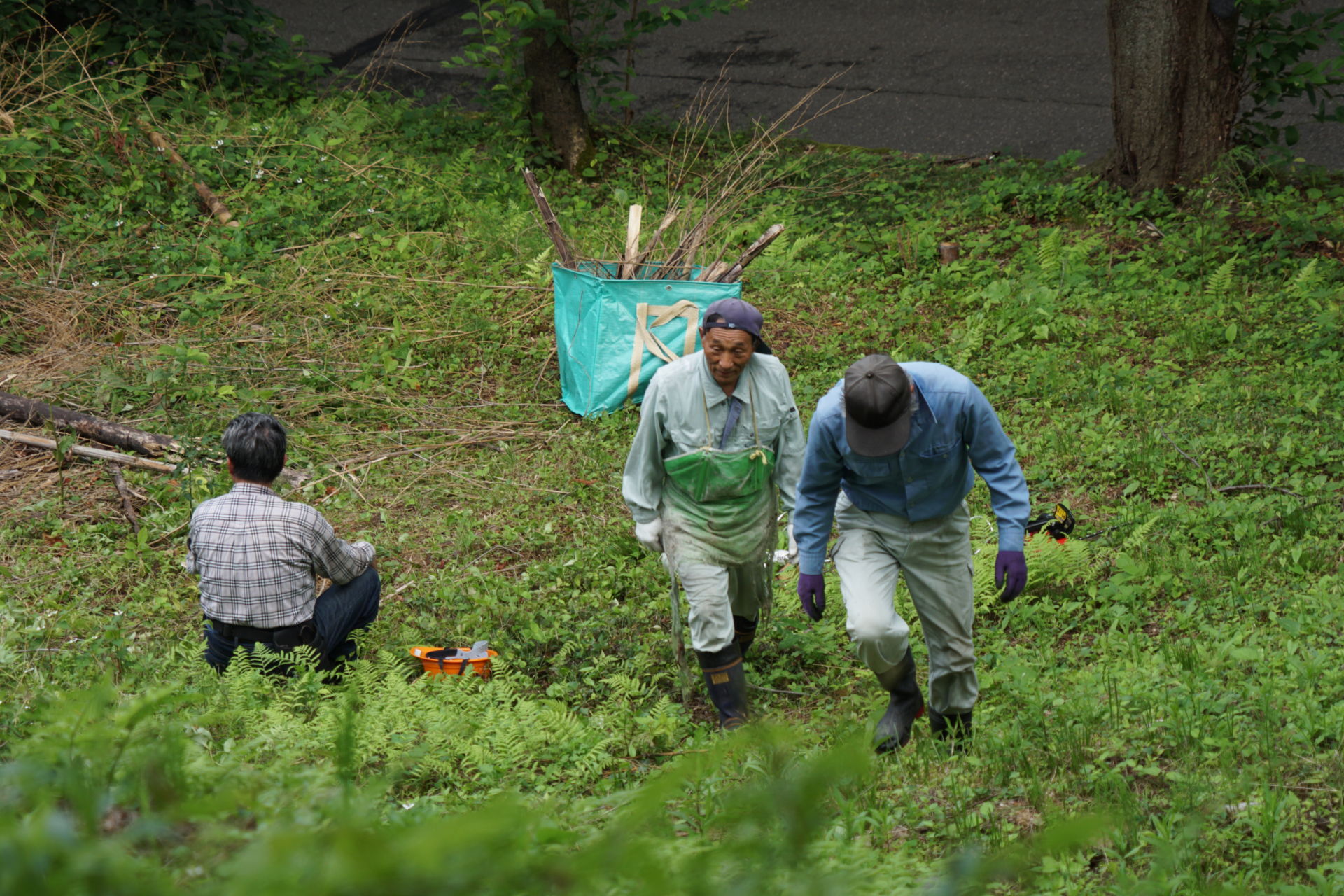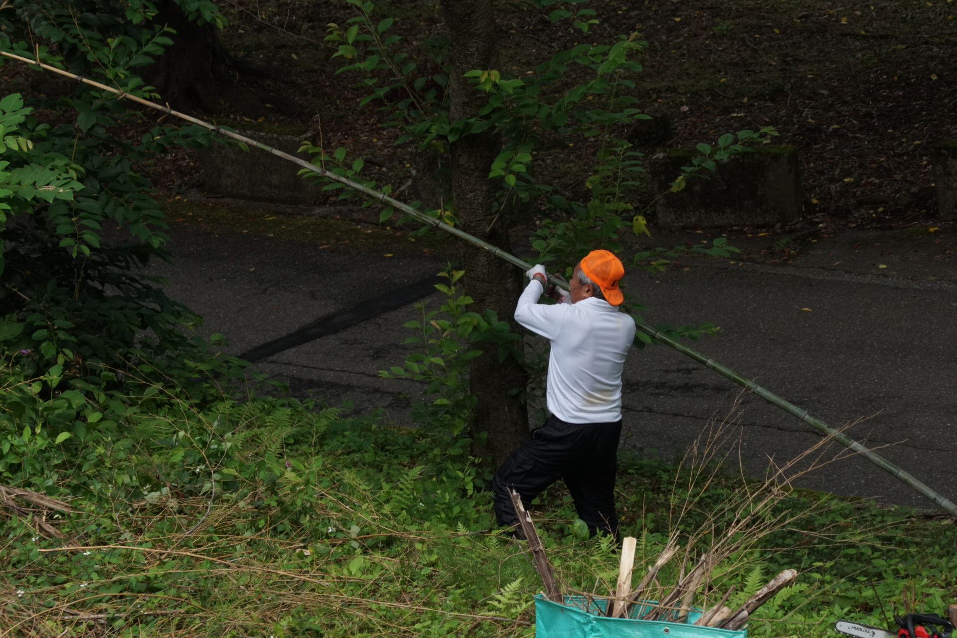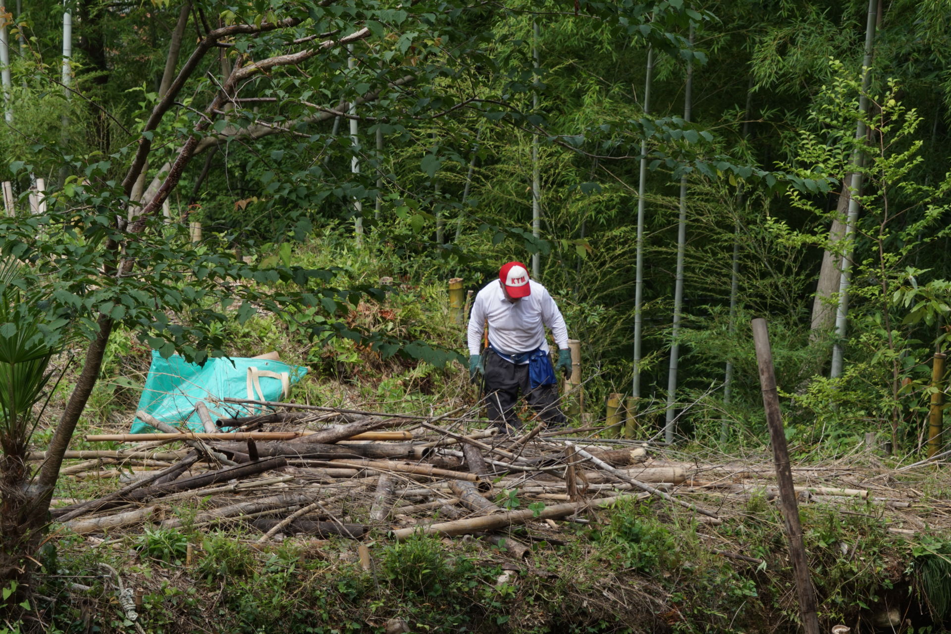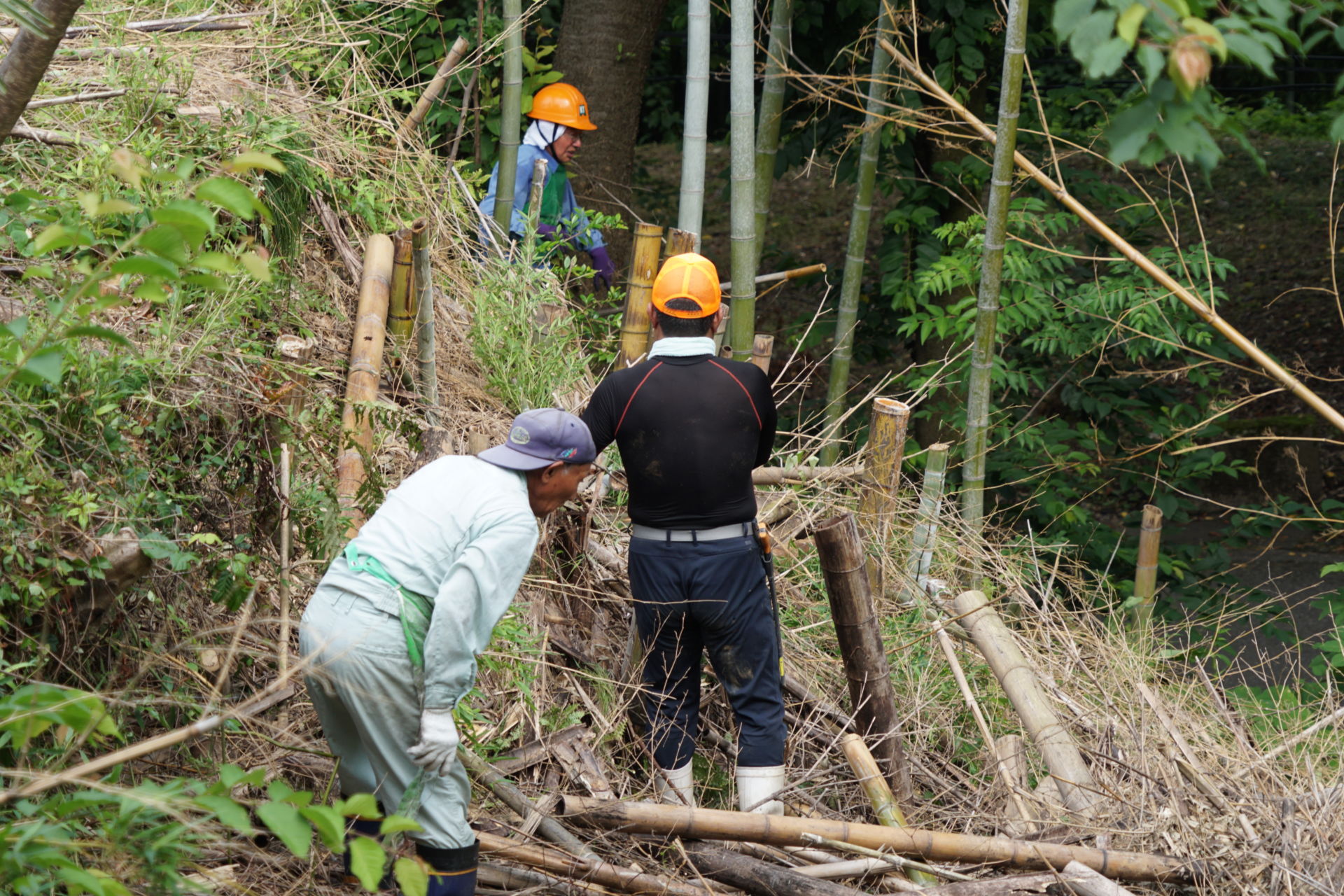 2021/6/27(日) 08:00~10:00 メンバー9人で棚下に放り投げていた竹を、粉砕機にかけられるように、倉庫前に集積しました。