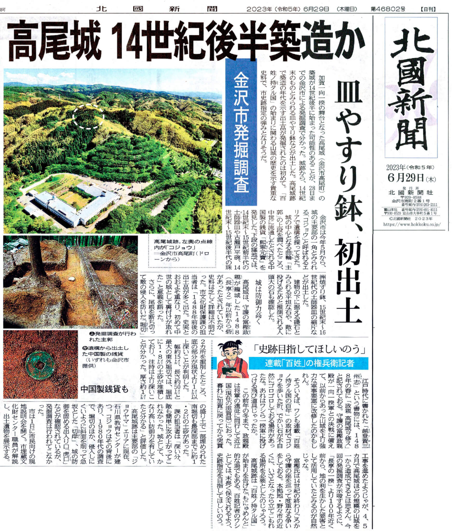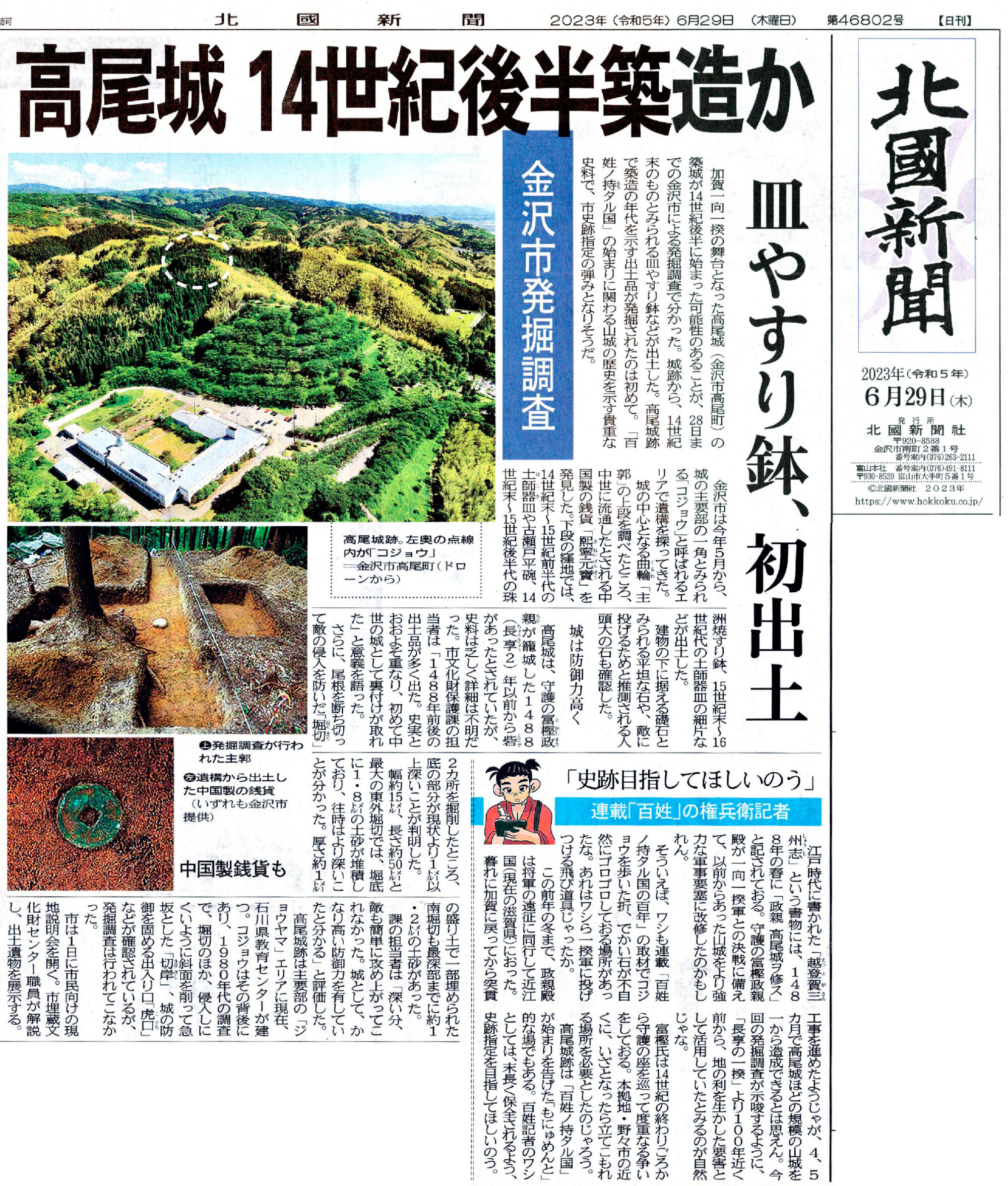 金沢市発掘調査 2023/06/29 北國新聞by 武野に 北國新聞、発掘調査on 投稿日: 2023/06/292023/06/29 2023/06/29の北國新聞に以下のような記事が掲載されました。
