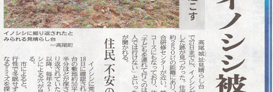 北國新聞 2023/02/28 朝刊に「高尾城址 イノシシ被害」のタイトルで高尾城址見晴らし台が紹介され、 草刈りや修繕は住民有志で作る金沢高尾城址見晴らし台愛好会が行っている。と紹介されました。